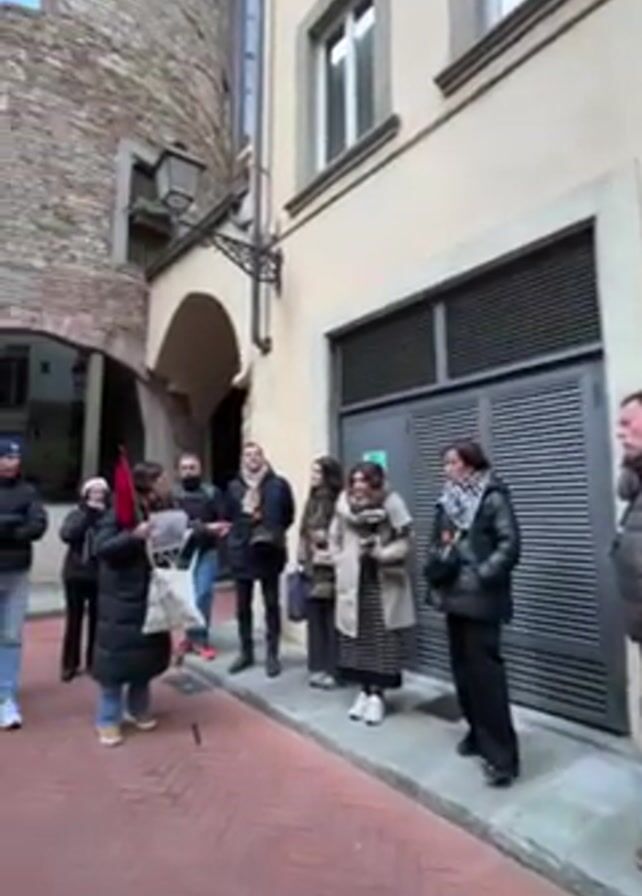 A group of approximately a dozen people are gathered on a red brick-paved street, listening to a tour guide who is gesturing with a red-colored item in her hand. The group is diverse in age and attire, many wearing winter coats and scarves. Some are looking at their phones or maps. They are standing in a narrow street or alleyway, flanked by buildings on both sides. To the right is a beige building with dark gray doors and windows. To the left, there's a taller, more rustic-looking structure, possibly a tower, constructed from stone or brick with arched openings and windows. The sky is overcast, providing diffused lighting. The architecture suggests an old European city.