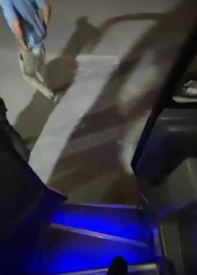 A person descends the illuminated blue steps of a bus, emerging onto a dark street at night