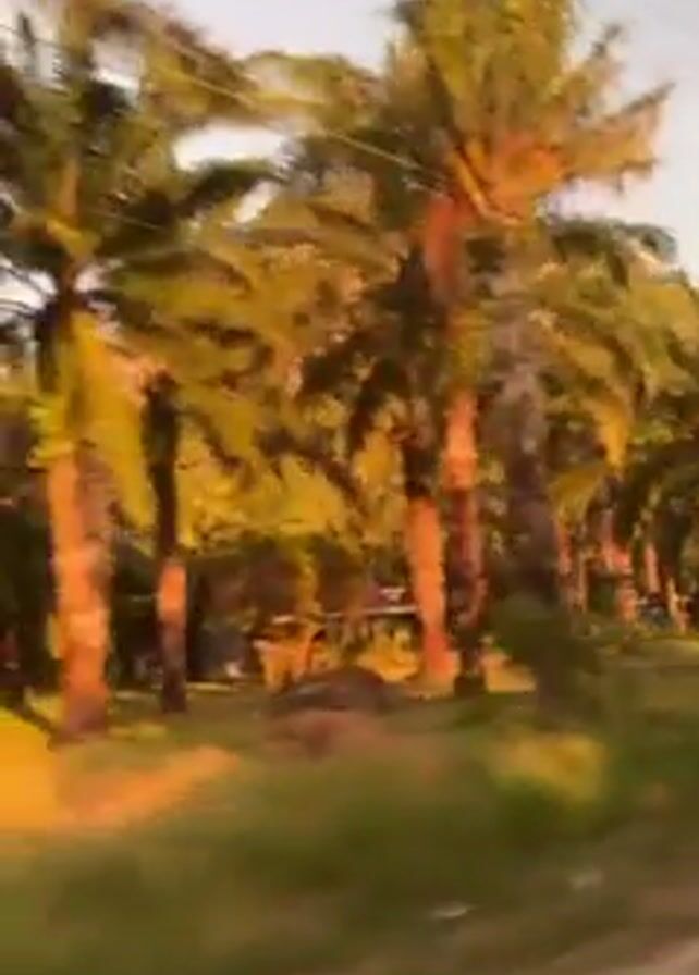 quick view of palm trees along a roadside, likely taken from a moving vehicle. The trees are lit by a warm, golden light, suggesting either sunrise or sunset. There's green grass at the base of the trees, and glimpses of structures, possibly houses, in the background. A blue plastic container is visible at one point. The sky is clear and light blue. The camera is moving, causing the trees to appear blurred. There is laughter in the audio.