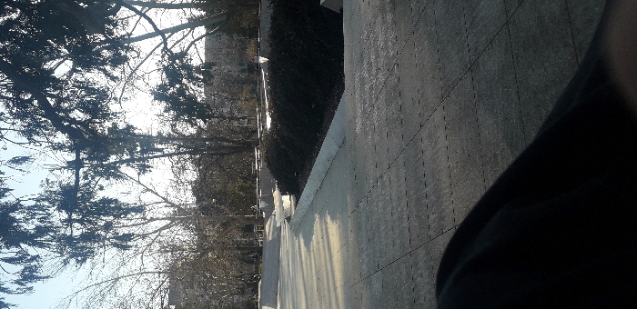 The image captures an outdoor urban plaza or park setting in the City of Unknown, Unknown, under clear daylight conditions with strong sunlight. The foreground is partially obscured by dark fabric, likely a person's leg or lap. The ground is paved with dark grey square or rectangular tiles, displaying visible grout lines. A paved pathway extends into the midground, where sunlight casts defined shadows. To the right, a raised planter containing dense, dark green foliage is bordered by light-colored concrete retaining walls. In the mid-distance, several light-colored picnic tables and benches are distributed across the paved area. Two individuals are discernible: one person is seated at a table on the left, and another is visible near seating further to the right. The background features numerous trees, many appearing deciduous with bare branches against a bright, clear sky. Faint architectural structures are visible through the trees in the far background.