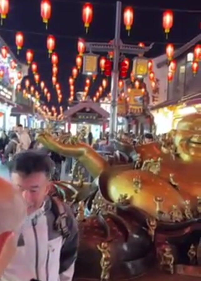 golden Buddha statue in a bustling night market, with many red Chinese lanterns strung overhead. Several people are walking around the statue, and one man is posing for a photo next to it. The statue is surrounded by small figures and intricate carvings.