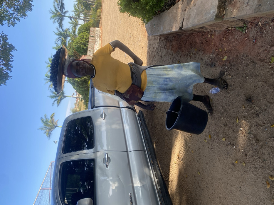 An outdoor scene in Jos, Nigeria, depicts a dark-skinned woman standing on unpaved, sandy ground under a clear blue sky