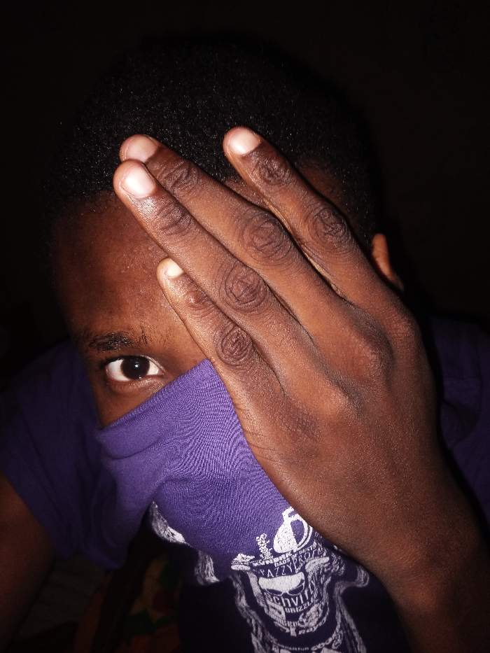 A close-up shot shows a Black man covering part of his face with his hand and a purple t-shirt. Only one eye is visible, looking directly at the camera. His hair is short and dark. His right hand covers the upper half of his face with the fingers spread out. The t-shirt with a white graphic design is partially visible covering his mouth and lower part of the face. The background is dark and out of focus.