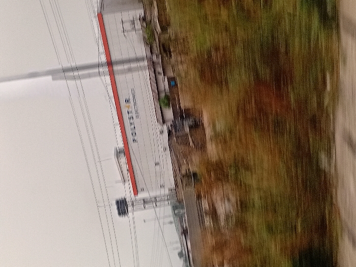 A blurred, rotated image shows a light gray building with the words "POLYSTAR ELECTRONICS" in bold, red lettering. Power lines traverse the sky above the building. The right side of the image features a blurry mix of brown and green vegetation. A portion of a concrete road or sidewalk is visible on the far right. The overall impression is of a roadside scene with a manufacturing plant and overgrown greenery.