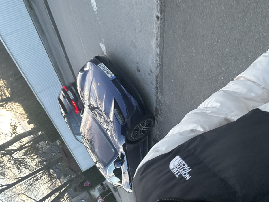 The scene depicts a street in Grünwald, Germany. A dark blue Porsche Taycan electric vehicle, bearing German license plate M MN 6189 E, is positioned at an angle on an asphalt road. Its front and left side are visible, with reflections of bare trees and a warm sky on its surface. In the background, a dark-colored SUV is observed driving on the same road, exhibiting slight motion blur. The foreground captures the upper torso and left arm of an individual, wearing a black and white jacket emblazoned with "THE NORTH FACE" logo on the left chest. The environment includes bare deciduous trees and residential structures in the background, alongside a light-colored, possibly corrugated, fence or wall. A circular traffic sign with a red border is partially visible on the left side of the road. The lighting indicates either early morning or late afternoon, with soft, directional light. The road surface consists of asphalt, bordered by a concrete curb.