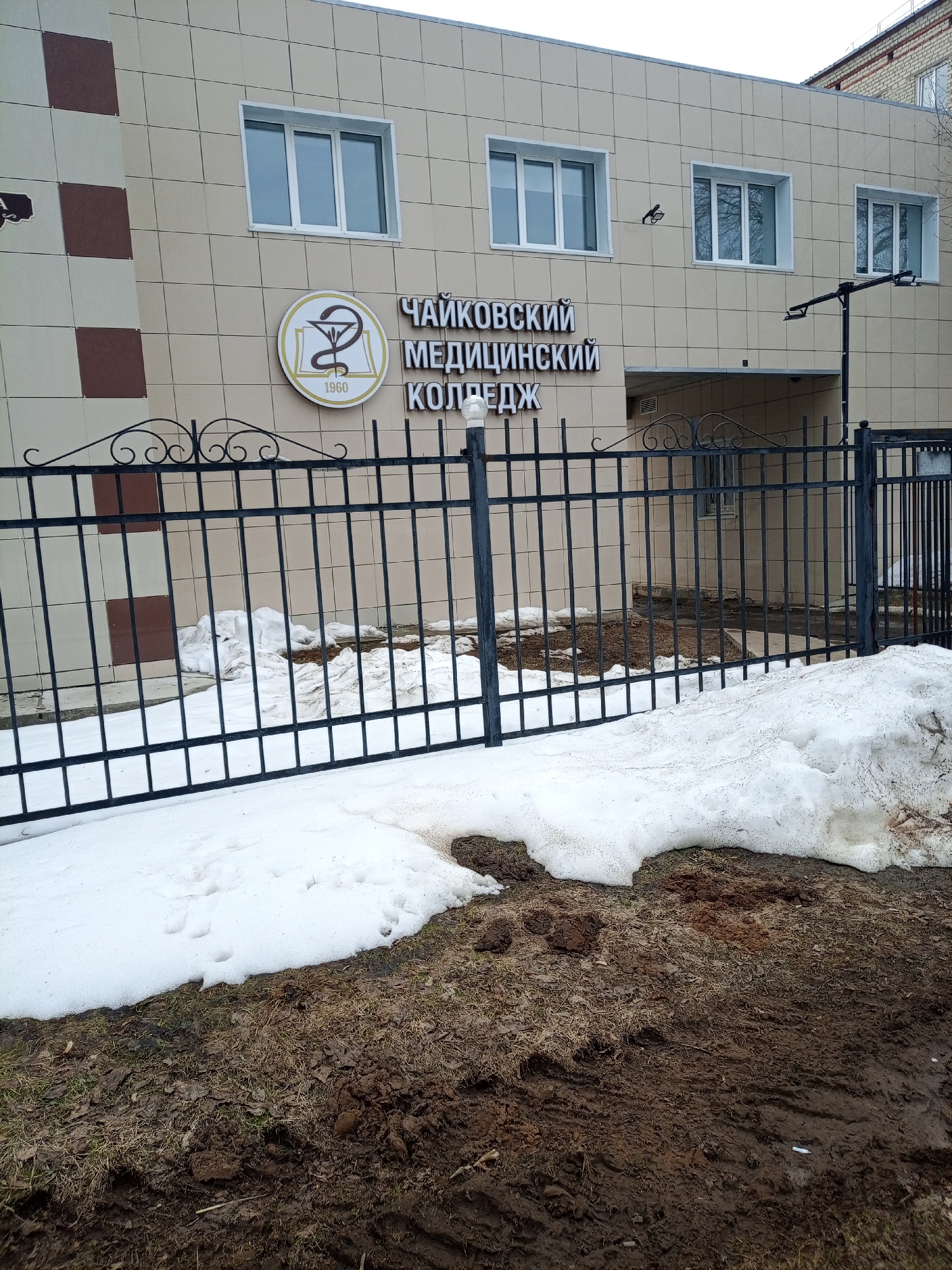 The image displays the exterior of the Chaikovsky Medical College (ЧАЙКОВСКИЙ МЕДИЦИНСКИЙ КОЛЛЕДЖ) in Chaikovsky, Russia. The building's facade is constructed from light beige rectangular tiles, with a vertical strip of alternating light beige and brown square tiles visible on the left. A circular emblem is affixed to the facade, featuring a medical caduceus symbol and the year "1960," situated above the college's name in dark Cyrillic characters. Three white-framed windows are visible on the upper floor, with one more partially visible on the lower left. A black metal fence, composed of vertical bars and decorative scrollwork at the top, extends across the mid-ground, separating the viewer's position from the building. The foreground consists of irregular patches of melting snow, dark brown exposed soil, and dead, dry grass or foliage. Behind the fence, closer to the building, additional dirty snow piles are present on what appears to be a paved or concrete surface. A black metal street light post with a horizontal arm extends from behind the fence on the right. No individuals are present in the scene. A white cigarette butt is visible on the muddy ground in the lower right portion of the image. The sky is overcast, suggesting diffuse natural lighting.