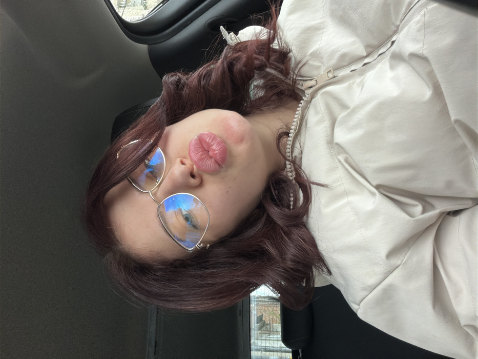 A single individual, appearing as a young female, is depicted from the chest up, seated inside a vehicle. She has shoulder-length, dark reddish-brown, wavy hair and wears gold-toned, cat-eye style eyeglasses with prominent blue reflections on the lenses. Her lips are pursed in a "kiss" gesture. She is wearing a light-colored (beige or cream) puffer jacket with a partially visible zipper. The vehicle interior behind her includes a dark headrest and a dark headliner. Through a window on the left, an exterior scene shows a light-colored building facade, possibly brick, and sparse tree branches. This scene is located in Nova Zagora, Bulgaria.