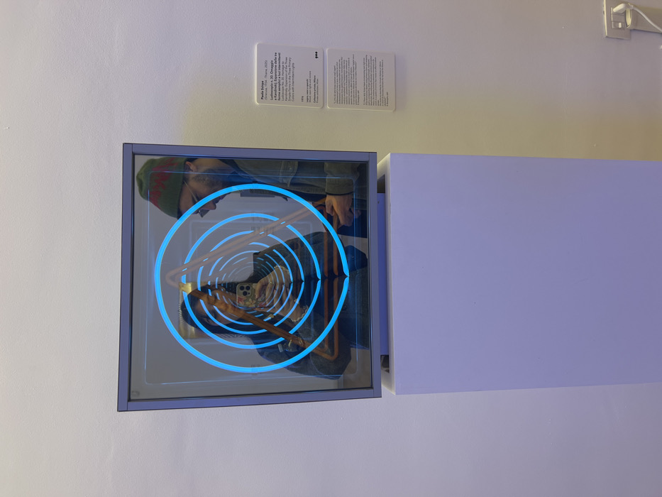 An illuminated artwork titled "Ludoscopio n. 20. Omaggio a Kandinsky. Espansione delle tre forme semplici a luci intermittenti" by Paolo Sarpato (1934-2021) is displayed in what appears to be an exhibition space in Milan, Italy, as indicated by the artwork's private collection location. The artwork, dated 1970 and constructed from wood, plexiglass, and mirrors, consists of a rectangular frame containing a reflective surface. Within the artwork, glowing blue concentric circles and a triangular outline create an optical illusion of depth, resembling a tunnel. Reflected in the artwork's surface are two individuals. A person, presumed to be the photographer, is centrally reflected, holding a smartphone with a prominent multi-lens camera array, actively taking the photograph. This individual wears a dark-colored garment. To the right, another person is partially reflected, wearing a green beanie and glasses, and appears to be looking downwards, possibly at a handheld device. The artwork rests on a white, rectangular pedestal. To the right of the display, two white informational plaques are affixed to a plain white wall, providing details about the artist, title, date, materials, and collection. A white electrical outlet with a plugged-in cord is visible on the lower right portion of the wall. The overall environment suggests a minimalist art gallery or exhibition setting.