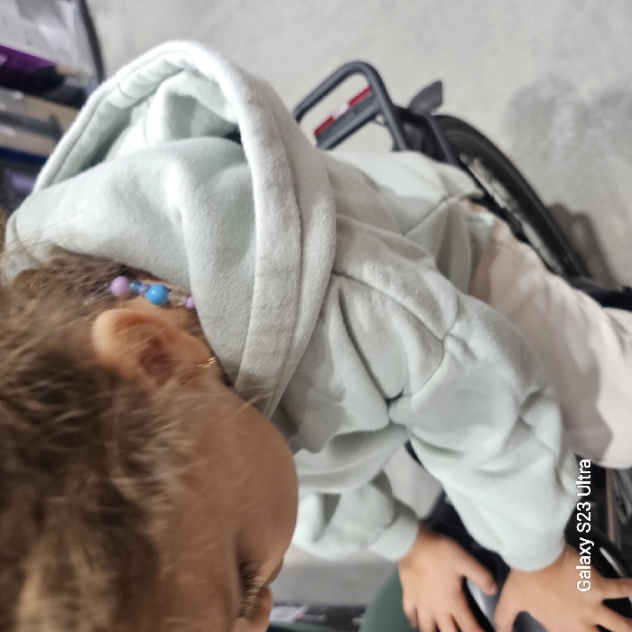 A child with brown hair wears a light green hoodie. The hood is up, obscuring much of their face. Their ear is visible, adorned with a small gold hoop earring and colorful beaded hair clips. The child's eyes are closed. They sit in what appears to be a wheelchair, visible in the background, with the child's hands resting on a part of the chair. A "Galaxy S23 Ultra" watermark is visible on the bottom right corner of the photo.