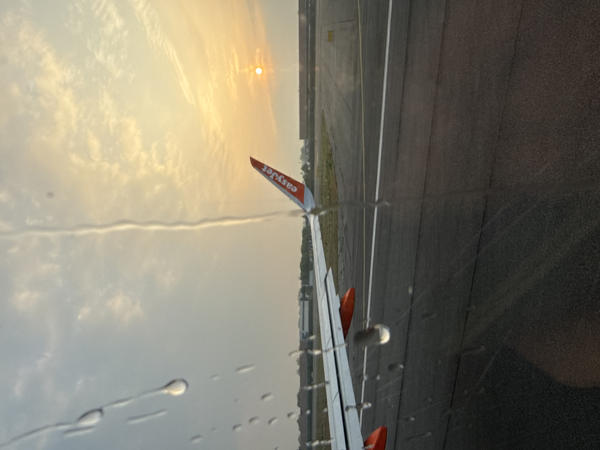 View from inside an airplane, possibly an EasyJet plane, on a runway at an airport, with rain drops visible on the window. The sun is setting, and clouds are visible in the sky. The location could not be determined in the city of Peschiera Borromeo.
