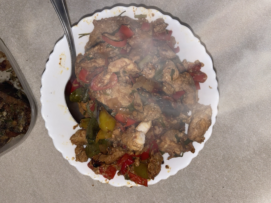A white, scalloped-edge ceramic plate, positioned prominently in the lower-center, contains a hot meal, from which visible steam rises. The meal consists of irregularly shaped, brown-toned pieces of cooked meat, intermixed with diced red, green, and yellow bell peppers, and fragmented red elements resembling tomato slices. A silver-colored spoon is partially inserted into the food, with its handle extending towards the upper right. In the upper right background, a translucent plastic container holds a dark, textured, seasoned food item, partially obscured and out of focus. All objects rest upon a light beige, finely woven textile surface. This scene is located in Danilovgrad, Montenegro.