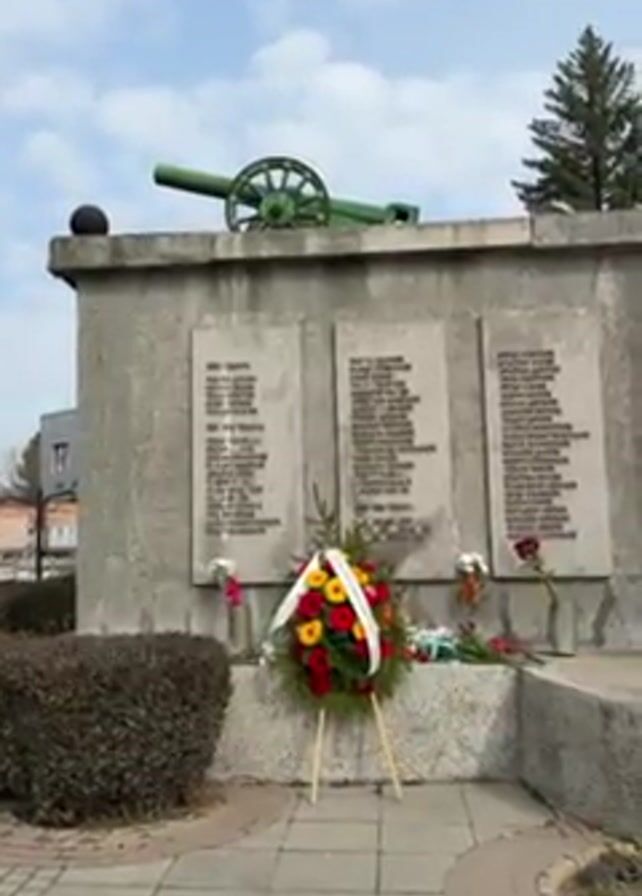 A static, medium shot captures a gray concrete war memorial on a cloudy day. A green, antique cannon is perched atop the memorial. The memorial has three stone panels, each inscribed with names. A colorful wreath, primarily composed of red, yellow, and white flowers, stands on an easel in front of the memorial. Additional bouquets of flowers lie on the ground near the base. A trimmed bush is located to the left of the memorial. The ground is paved with gray and white tiles. In the background, a building and a tall, evergreen tree are visible. A black speaker sits on the ground on the right side of the memorial.