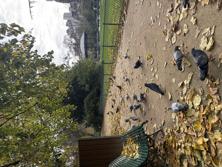 This image depicts an autumn scene within the Square des Batignolles, located in the 17th arrondissement of Paris, France. The foreground features a green slatted park bench with cast iron supports, angled towards the right, partially covered by numerous yellow and brown fallen leaves. Behind the bench, a tall, dark brown wooden barrier is present. The midground is dominated by a wide, unpaved dirt path heavily strewn with yellow and brown autumn leaves. Approximately 30-40 grey rock doves (pigeons) are scattered across this path, generally facing various directions, appearing to forage or rest. One dark grey pigeon stands prominently in the lower center foreground, facing right. To the right of the path, a low green metal fence with diamond-shaped mesh delineates a grassy lawn area, also with some fallen leaves. In the background, positioned on the lawn, a black metal bandstand (kiosque à musique) with a distinctive domed roof and ornate columns is visible. Beyond the bandstand and intervening trees, classic light-colored Haussmannian apartment buildings with grey roofs and chimneys rise against an overcast sky. Two indistinct human figures are seated or standing on the grass near the bandstand in the far right background. The overall environment suggests a publicly accessible park setting during daylight hours.