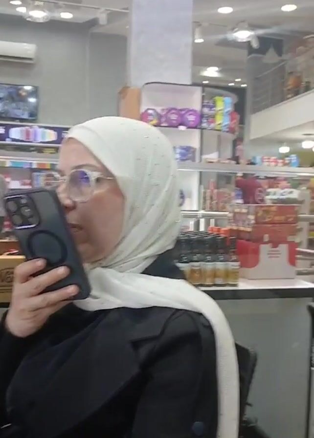 A woman wearing a white hijab and glasses is talking on a cell phone inside of a convenience store. The store has two floors, fluorescent lighting, and shelves stocked with a variety of products. The woman is wearing a black blazer. There are boxes of snacks and drinks visible on the counter in front of her. Another person is walking in the background.