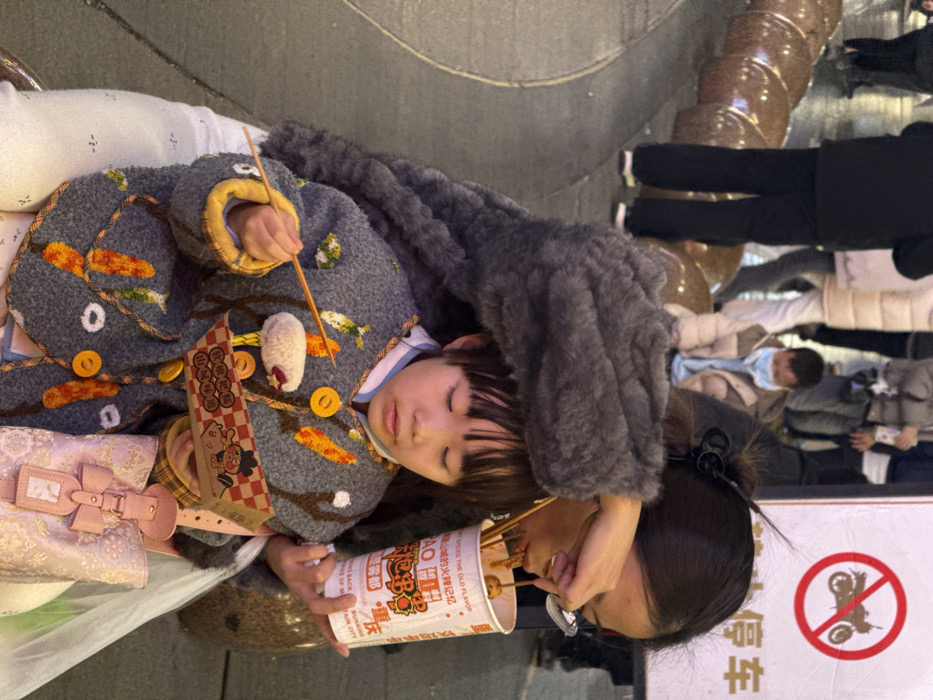 In Liangjiang, China, an adult female and a young child are depicted in a public, illuminated setting. The adult, positioned on the right, wears a dark gray, textured, long-sleeved garment and has dark hair secured with a black claw clip. She is observed actively eating from a white paper cup, adorned with red Chinese characters ("火锅冒烤鸭"), using a silver spoon to retrieve food items from multiple skewers within the cup. The child, seated to the left, wears a gray coat featuring yellow buttons and colorful embroidered designs. The child has dark hair with bangs and holds a thin wooden skewer in her right hand, while her left hand cradles a small, rectangular paper food tray with a checkered pattern and cartoon illustrations. Her eyes are cast downwards. A pink handbag, detailed with a bow and an ornate pattern, rests beside the child. The background features several indistinct individuals, including one male wearing a light brown jacket and a blue face mask. A linear arrangement of large, spherical, brownish-gold objects borders the paved ground. A white sign with a red circle-slash symbol (indicating "no motorcycles") and corresponding Chinese text ("禁止摩托车停车") is visible on the far right.
