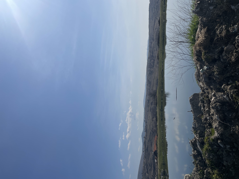The scene, located in Valkosel, Bulgaria, depicts an outdoor environment under a clear blue sky with sparse white clouds. The sun, positioned in the upper right, casts a bright flare. The background features undulating hills and distant mountains, characterized by dormant vegetation, appearing largely barren or sparsely covered with dried grasses and occasional trees devoid of leaves. A cluster of structures with visible red-tiled roofs is present on a lower hill towards the far left of the background. The midground is dominated by a calm body of water, reflecting the blue sky and clouds. Two dark, elongated objects float on the water's surface, one centrally located and a shorter one to its left. The far bank of the water shows a strip of green grass and scattered refuse, including what appears to be white plastic. The immediate foreground consists of dark, disturbed earth mixed with debris such as broken concrete, rocks, and general refuse. Patches of sparse green grass and dry, slender branches of a shrub or small tree are present on the right side, partially obscuring the water's edge. No human subjects, animals, or active interactions are visible within the frame.