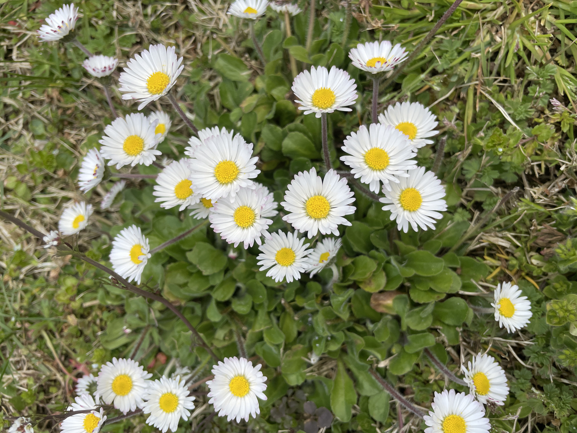 - "The image displays a close-up, overhead view of approximately two dozen common daisies (Bellis perennis) blooming on a patch of grassy ground in Chambéry, France" by FM-48J6M2, licensed under CC BY 4.0