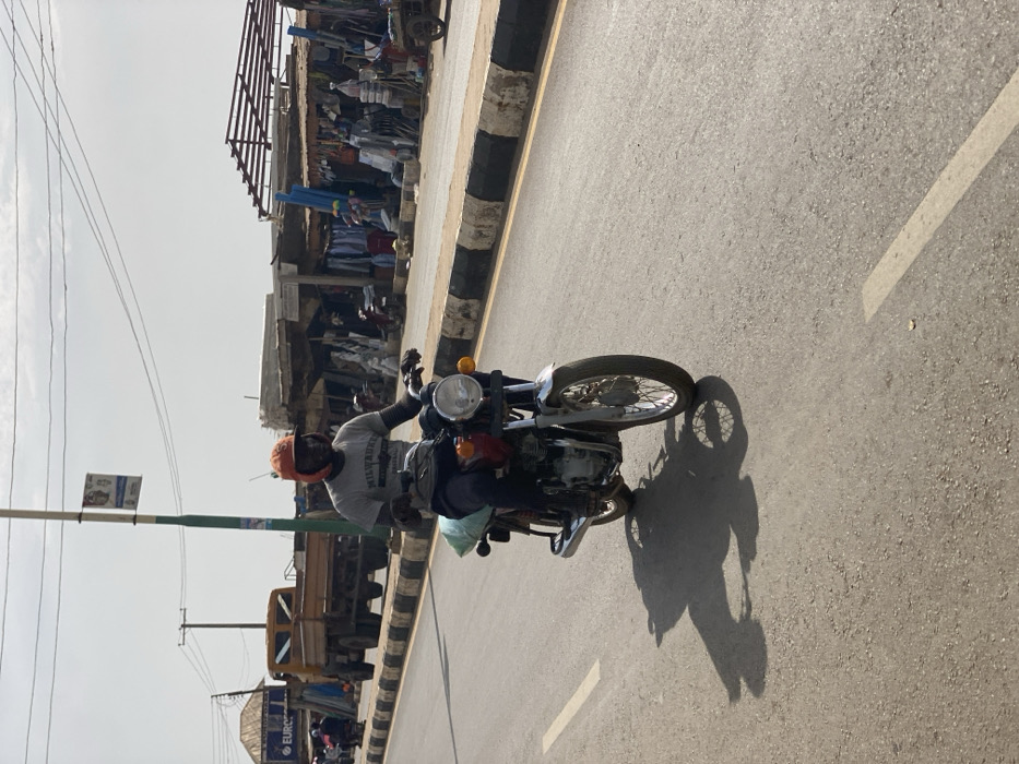 The image depicts a daytime street scene in Kafanchan B, Nigeria, characterized by an individual operating a motorcycle on an asphalt road