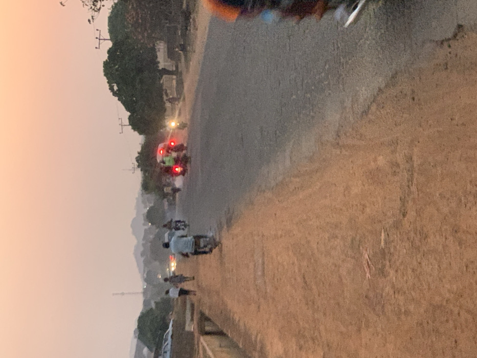 A hazy scene unfolds along a road, likely at dusk. A vehicle with flashing red lights, possibly an emergency vehicle, is visible in the distance. A few people are walking and riding motorcycles along the roadside. The road surface appears worn, and there's evidence of a guardrail. Trees and structures are visible lining the road. The overall atmosphere conveys a sense of rural or suburban life.