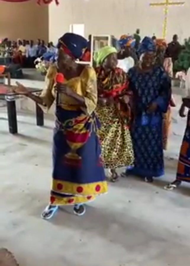 The video captures a lively scene inside a large, brightly lit hall, likely a church or community center, where an older woman leads a group of women in song and dance. The lead woman, positioned at the front, is dressed in a yellow, patterned top and a long, dark blue skirt with yellow and red designs; she holds a microphone and gestures expressively with her left arm. Behind her, a group of about six women, dressed in vibrant, colorful outfits and headwraps, move along with the music, stepping and swaying gently. In the background, a larger group of seated people watches the performance. The hall is decorated with red and green streamers, and a cross adorns one of the walls. The atmosphere seems joyful and celebratory.