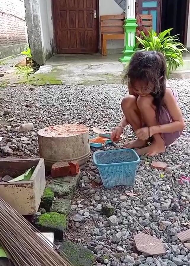 A young girl wearing a purple dress is squatting on a gravel ground in front of a house. She is barefoot and has her hair tied back in a ponytail. In front of her is a blue plastic basket, and she appears to be sorting through small objects, possibly toys or trinkets, placing them into the basket. To her left is a weathered wooden box, a cylindrical object (possibly a tree stump or a concrete block), and a stack of bricks. A broom lies on the ground next to the box. The background shows a house with a brown wooden door on the left and a door with teal-colored accents on the right. A wooden bench is placed in front of the house, and greenery is visible in the background, indicating an outdoor setting.