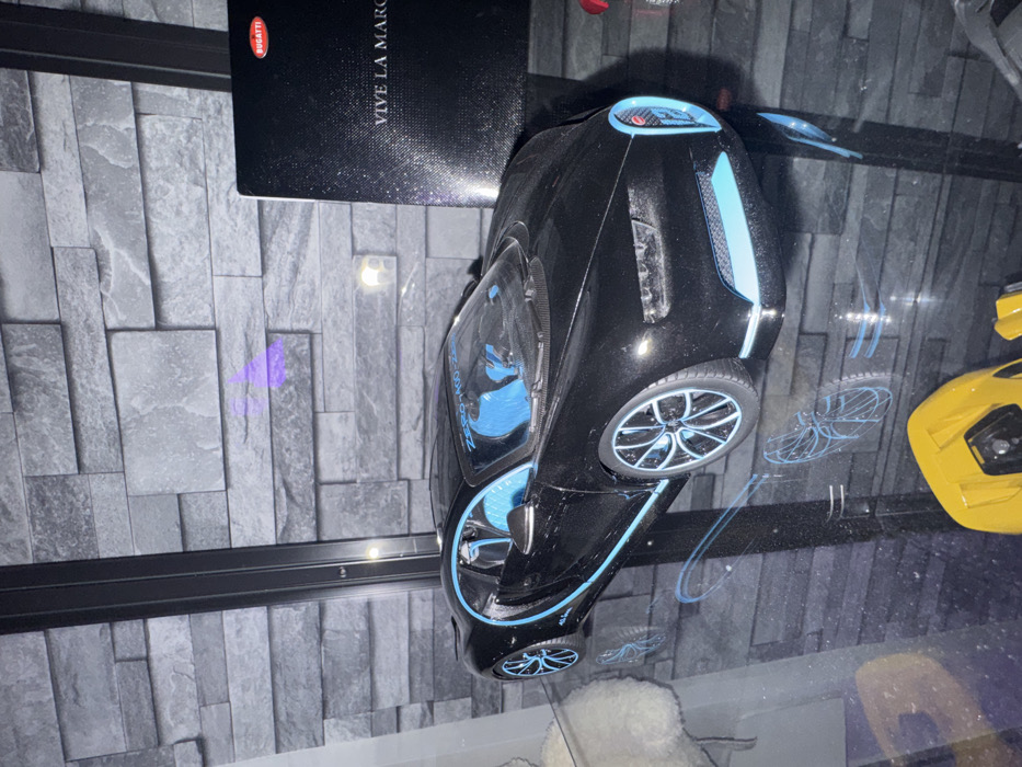 A black Bugatti model car sits on a reflective surface, next to its box. The box, also black, reads "VIVE LA MARQUE" and displays the Bugatti logo. The car has blue accents and detailed wheels. Reflected on the surface is a sketch of the car's wheels. A yellow sports car model is visible in the background, partially obscured. A white, fluffy object is also present in the lower portion of the frame. The surface has a tiled appearance and there are some light reflections.