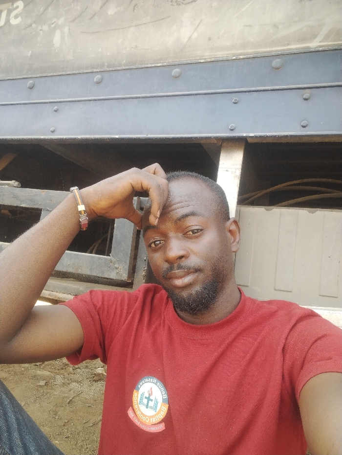 An adult male with dark complexion, short dark hair, and a full beard and mustache is depicted. He is wearing a red short-sleeved t-shirt featuring a circular logo on the left chest, which contains text including "BENE MASTERS BAPTIST CONVENTION," an open book, and a torch symbol. A multi-colored bracelet is present on his left wrist. His left hand is raised, with fingers resting against his forehead. He looks directly at the camera. The subject is positioned in front of a large, dark grey metallic structure, consistent with the underside or side of a heavy vehicle or machinery, showing rivets and beams. A partially visible white rectangular object, possibly a container or battery box, is located on the right side of the background beneath the metallic structure. Cables are also visible in the background. The ground is composed of light brown dirt. The specific location within Abuja, Nigeria, is not discernible from the provided image.
