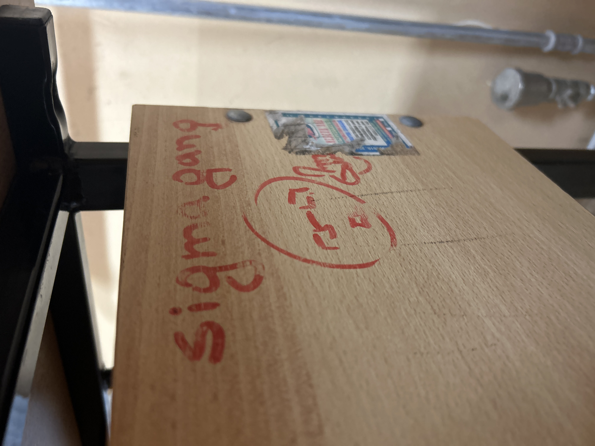 close-up of a wooden surface, likely a tabletop or shelf, with writing on it in red marker. The writing includes the words "Sigma Bang" and a circled phrase that appears to be written in Bulgarian. There's also a torn sticker adhered to the wood surface. The wood appears to be part of a structure with black metal supports. A metal bar is visible in the upper portion of the background. Due to the lack of identifying information in the picture, the location in the city of Varna, Bulgaria cannot be verified.