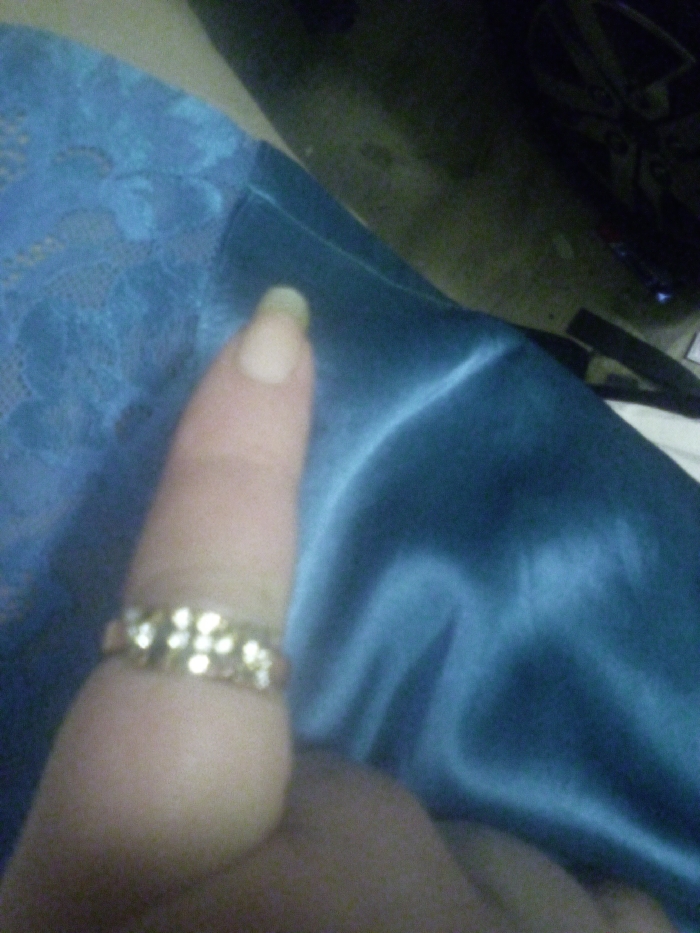 close-up of a person's right hand, with their thumb extended and a ring on the thumb. The ring appears to be gold with small, clear stones. The hand is wearing a blue, satin fabric. The coordinates provided, 48.442, -123.369, place this scene in the city of Victoria, Canada. The scene is likely indoors, as there is a dark, blurred surface in the background that may be a wall or other indoor object. The image is low resolution and lacks detail about the environment, so the exact location in Victoria cannot be determined.