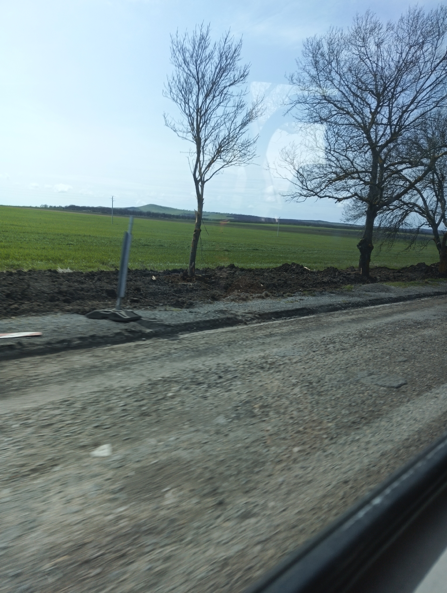 The image depicts a rural roadside scene, likely taken from a moving vehicle. The location is possibly near Sokolovo, Bulgaria, based on the request. In the foreground is a gray, gravel road. Beside the road is a narrow strip of dark soil, bordering a green field that stretches into the distance. Bare trees are scattered along the roadside and the edge of the field. A small hill is visible in the distance. A reflective sign post stands near the road. The sky is pale blue with a few clouds. The overall scene appears somewhat blurred, suggestive of motion.
