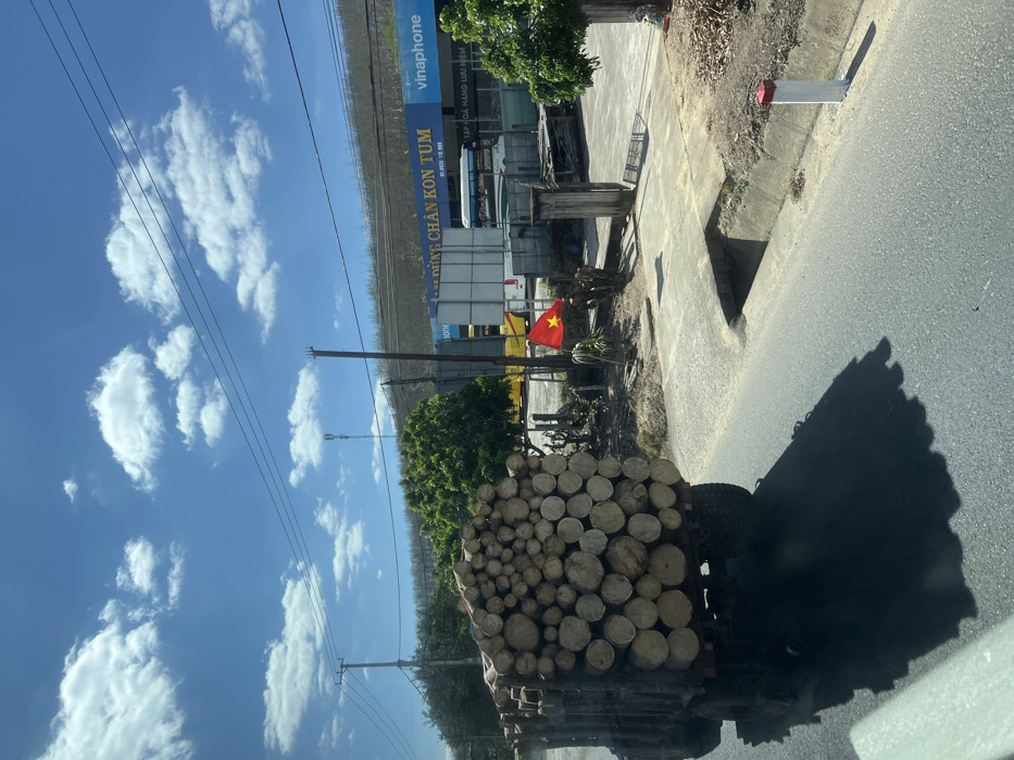 A truck loaded with a large pile of logs travels down a paved road under a bright blue sky with fluffy clouds. Power lines run alongside the road. A Vietnamese flag waves near a storefront with a "Vinaphone" sign. A red and white post marks the roadside. The shadow of the truck stretches onto the asphalt.