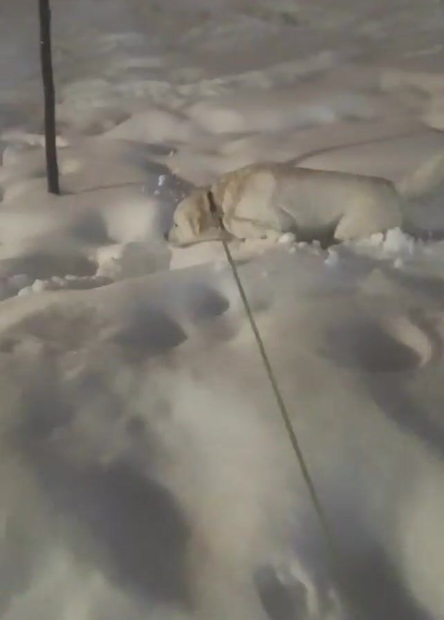 light-colored dog, possibly a labrador retriever, in a snowy environment at night. The dog is on a leash and appears to be digging in the snow, moving its head and body while partially submerged. Streetlights are visible in the background, illuminating the scene. The ground is covered in thick, uneven snow. The camera angle is slightly elevated, looking down at the dog.