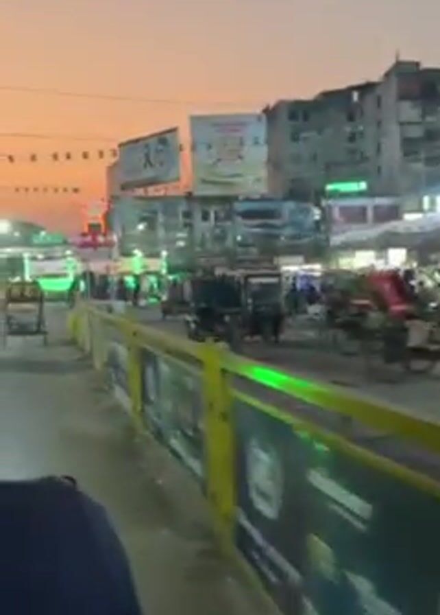 The video depicts a busy street scene at dusk or dawn. A man in dark clothing walks down a sidewalk bordered by a yellow and blue metal railing. Behind him, the street is filled with rickshaws, bicycles, and other vehicles. Several billboards and lit signs adorn the buildings lining the street. The sky above is a gradient of orange and pink. The camera appears to be moving, suggesting it's being held by someone walking.