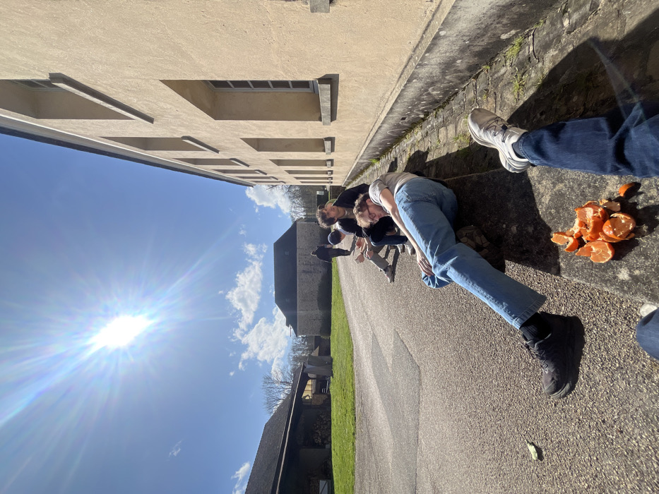 The image depicts an outdoor scene in Saint-Rémy-lès-Chevreuse, France, under a bright, sunny sky with scattered clouds. The sun, emitting a strong lens flare, is positioned in the upper left quadrant. In the foreground, the lower legs of an unseen individual, wearing dark blue jeans and white and grey sneakers, are visible in the bottom right corner. Adjacent to these legs, on a raised stone ledge running parallel to a building, a pile of orange or tangerine peels is present. To the left of the peels, a male individual is positioned horizontally on the stone ledge, lying on his back with his head resting against the building's base. He wears a light-colored t-shirt, light blue jeans, and dark shoes. Behind him, also seated on the ledge, are three other individuals. The closest of these is a male wearing a dark jacket over a light shirt and glasses, looking towards the left. Further back, a male in a blue cap is observed looking down, possibly at an object in his hands. A fourth seated individual is partially obscured. The stone ledge serves as the base for a multi-story building with a light beige or tan facade, featuring multiple recessed rectangular windows. The facade extends along the right side of the frame. The ground in front of the ledge is a dark, paved surface, showing minor cracks and a single green leaf. In the mid-ground, to the left of the paved area, is a patch of green grass. Further back, to the left, an open-sided shed with a dark sloped roof is visible, containing stacked firewood. Adjacent to this, in the center-back, stands a larger, older stone building with a dark, sloped roof. A solitary figure, dressed in dark clothing, is walking away from the camera towards this stone building. Bare trees are visible in the distant background, suggesting a seasonal context. Strong shadows are cast across the paved surface and the seated individuals, indicating the high sun angle.
