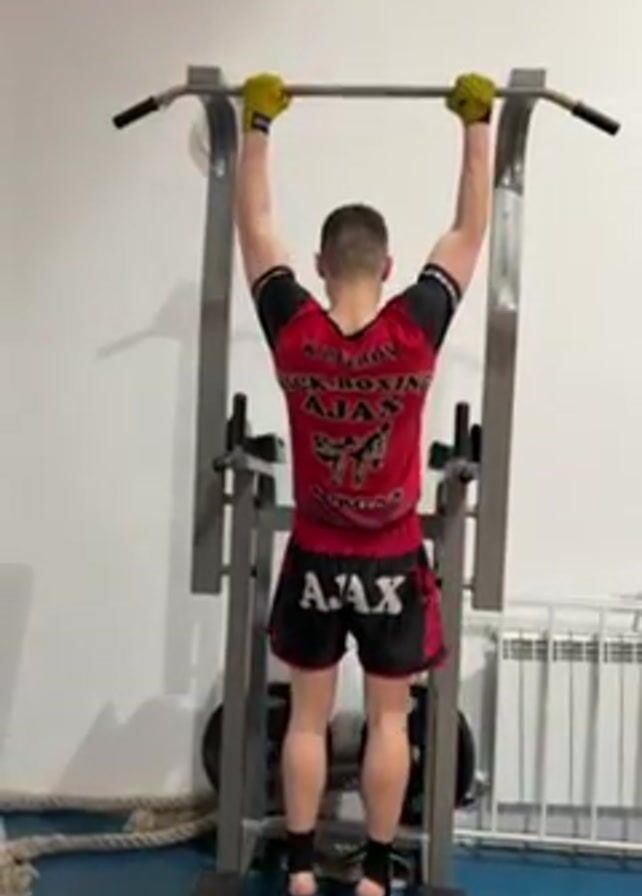 A young man is shown from the back, performing pull-ups on a metal pull-up bar machine in what appears to be a gym setting. He is wearing a red and black kickboxing t-shirt and matching shorts with the word "AJAX" printed on them. He also has yellow gloves on. The pull-up bar machine is silver, and there are weights and other gym equipment visible in the background. The walls are white, and there is a radiator near the machine.