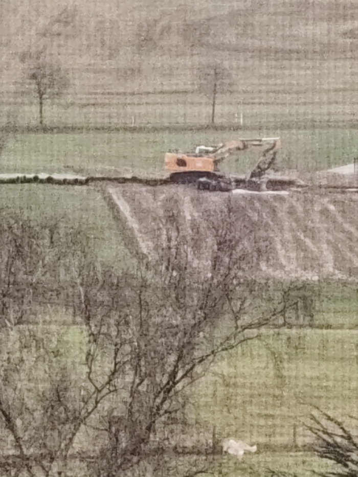 An aerial or elevated long-distance photograph depicts an outdoor scene in Leudelange, Luxembourg, characterized by ongoing earthworks. In the midground, an orange-colored trackhoe excavator is positioned on a linear earthen mound or bank, running horizontally across the frame. The excavator's boom and stick are extended forward and slightly downward, with its bucket appearing to engage disturbed brown earth or shallow water directly in front of its tracks. Sections of white material, potentially piping or construction debris, are visible adjacent to the excavator on the mound. Below this construction line, a sloping expanse of dark brown, disturbed earth descends into the lower midground. The foreground is dominated by a dense network of bare, dark tree branches, partially obscuring the view. In the background, beyond the construction zone, lie expansive green fields, interrupted by two isolated, leafless deciduous trees. A lighter-colored, irregular object, possibly an animal or debris, is present on the green field in the lower right quadrant. The sky is not visible, and the overall lighting suggests an overcast or hazy condition. No individuals are visible in the scene.