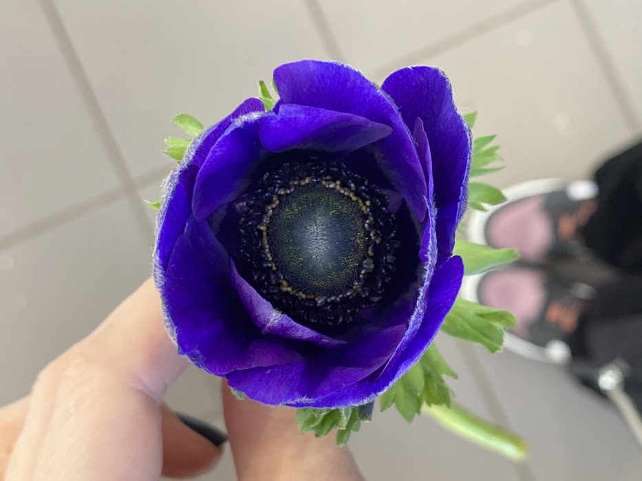 A vibrant, deep purple Anemone flower is held in a hand. The flower's petals are layered, curling inward towards a dark center with a ring of yellow. A few green leaves peek out from behind the flower. The background is blurry, with a glimpse of flooring and a pair of shoes with pink accents. The overall focus is on the striking contrast of the flower's color and its intricate texture.