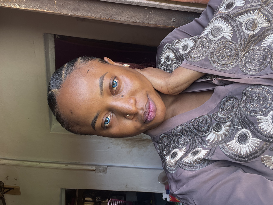 An adult female is depicted in a medium shot, facing forward with a subtle smile. She possesses medium-dark skin, dark hair styled in braids, and light blue irises, possibly from contact lenses. A small silver stud piercing is present on her left nostril, and her lips are colored with mauve-pink lipstick. She wears a muted plum-colored garment, possibly a robe or abaya, featuring elaborate white, grey, and gold embroidery with circular and floral motifs and small embellishments. A small gold earring is visible on her right earlobe. Her left hand is raised, with fingers lightly touching her neck/jawline. The background indicates an indoor setting in Sabon Tasha, Nigeria, with a light-colored wall. To the viewer's left, an open doorway reveals a dimly lit interior with indistinct objects. To the viewer's right, a darker wooden frame is partially visible. A light switch or electrical outlet is mounted on the wall to the left.