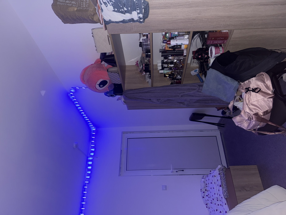 An interior room, identified as being in the city of Burgas, Bulgaria, is depicted under blue LED strip lighting that traces the perimeter of the white ceiling. A white smoke detector is centrally mounted on the ceiling. On the left wall, a light-colored, single-panel door with a silver handle is partially open or closed. In the lower-left foreground, a bed with a light wood base, a white fitted sheet, and a white duvet featuring a red heart/dot pattern is visible. A multi-shelf wooden storage unit occupies the right side of the room. The top shelf contains a large pink plush toy, multiple handbags (including one white quilted), and a brown paper bag. The open shelves below are densely organized with numerous bottles, likely perfumes and cosmetic products, along with various small containers and brushes. A grey bathrobe hangs on the left side of the unit, and a pair of bleached denim shorts or jeans hangs on the right. A dark, possibly black, folding chair or stool stands near the door in the mid-ground. In the foreground, a pink or rose gold duffle bag rests on an unseen surface, partially covered by a blue towel and a dark piece of clothing. No individuals are present.