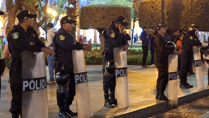 Several police officers stand in a line on a brick sidewalk, each holding a riot shield with "POLICIA" printed on it. They are dressed in dark uniforms with hats and appear to be guarding an area. In the background, people stroll in a public square, with trees and buildings visible. The lighting suggests it is dusk or early evening.