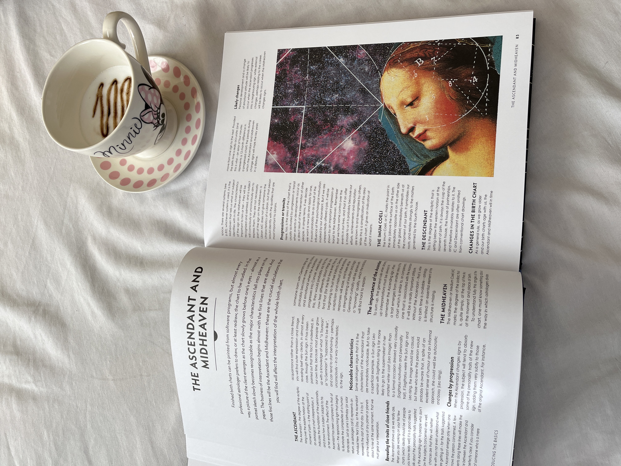 The image depicts an open book titled "THE ASCENDANT AND MIDHEAVEN" resting on an off-white, finely textured fabric surface