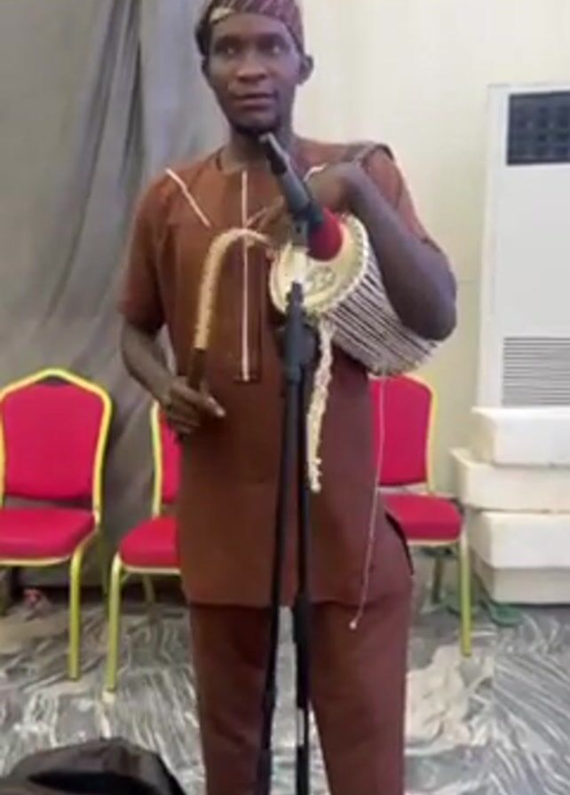 A man is standing in front of a microphone, playing a talking drum (also known as a dundun). He's wearing a brown traditional outfit with a matching cap. The drum is held over his shoulder, and he's using a curved stick to strike the drumhead. Behind him, there are red chairs, a dark suitcase, white boxes, and a patterned wall. The microphone is mounted on a stand. The man looks directly at the camera as he plays. A grey curtain is partially visible in the background.
