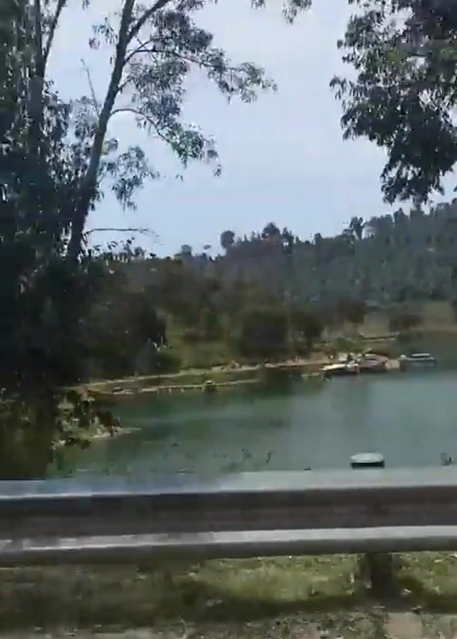 The camera, seemingly inside a moving vehicle, films through the side window. A metal guardrail is visible, and beyond it, a green, tree-lined lake extends into the distance. The opposite shore of the lake rises slightly, covered with dense vegetation. The sky is overcast, with a soft, diffuse light. There are occasional glimpses of structures, possibly houses, amongst the trees on the far shore. The video's movement suggests a smooth ride along a paved road.
