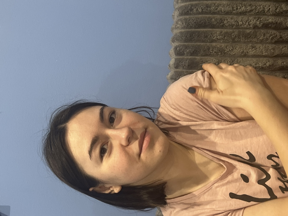 A young adult female is depicted in an indoor setting. The image does not contain visual information to confirm the specific location in Odesa, Ukraine. The subject has dark, shoulder-length hair and fair skin, and is looking directly at the camera with a subtle, closed-mouth smile. She is wearing a light pink, short-sleeved t-shirt. Her right hand is gripping her left bicep, and her fingernails are painted a dark color. The background consists of a solid light blue wall and, on the right side, a textured, ribbed surface, likely a grey upholstered couch or chair armrest.