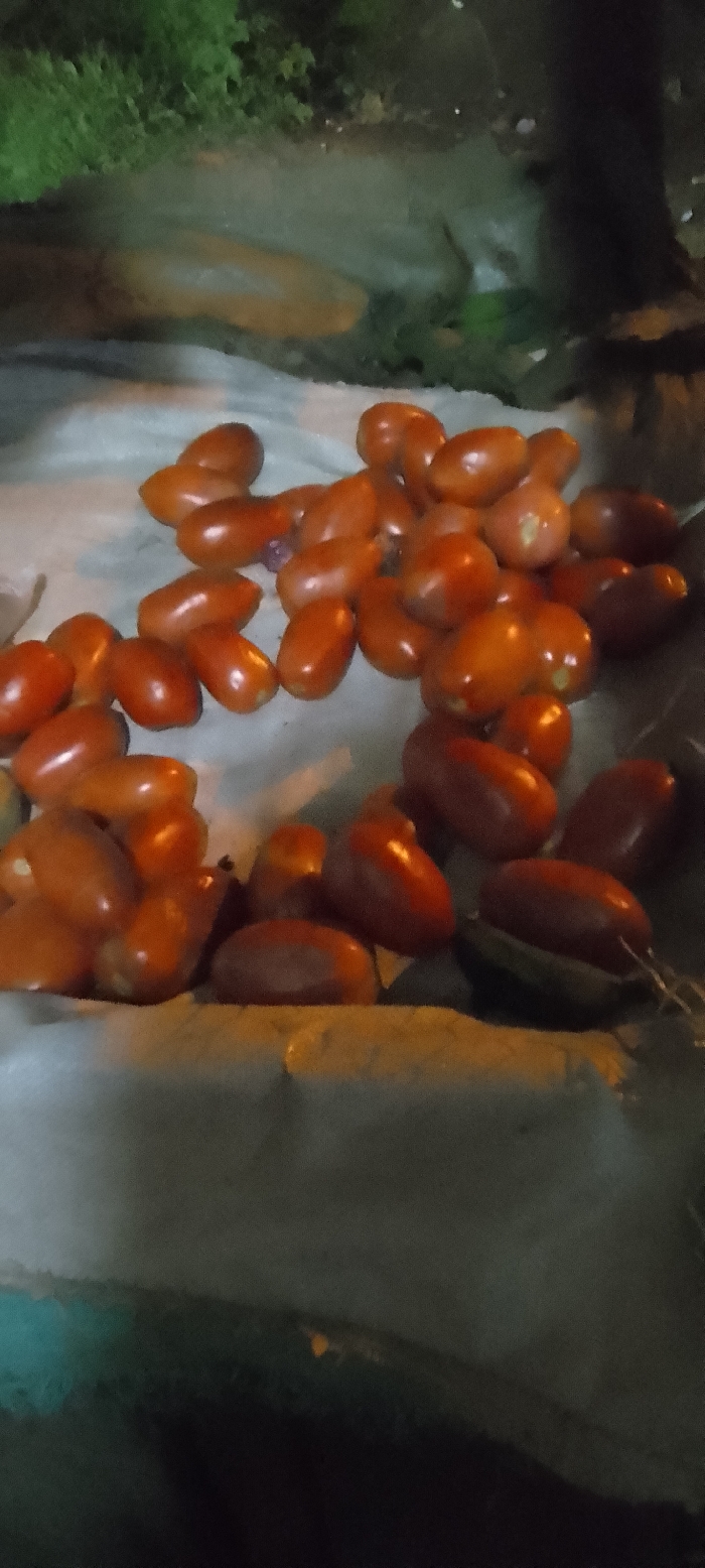 A gathering of elongated, reddish-brown tomatoes rests on a surface, possibly a sheet or tarp. The tomatoes appear ripe and have a smooth, shiny skin, reflecting light. A few are slightly darker in color, suggesting variations in ripeness. The background shows hints of vegetation, suggesting an outdoor setting, potentially a garden or harvest area. The lighting is somewhat dim, casting shadows and adding depth to the composition.