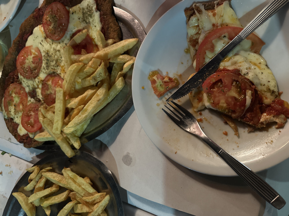 The image displays a tabletop view of a meal in a restaurant setting, located in the city of San Isidro, Argentina. A large, oval-shaped milanesa a la napolitana, characterized by its breaded base, tomato sauce, melted cheese, sliced tomatoes, and a sprinkle of dried herbs, occupies the center on a silver serving tray. A substantial quantity of golden-brown french fries is piled over a portion of this milanesa and extends onto the tray. To the upper left, a separate, smaller silver tray holds an additional portion of golden-brown french fries. In the foreground, a white ceramic plate shows remnants of a partially consumed milanesa a la napolitana, with a silver dinner fork and a serrated knife resting diagonally across the remaining food. The table surface is covered with a white tablecloth or paper, exhibiting a minor liquid stain. The scene is illuminated by ambient, possibly artificial, lighting.