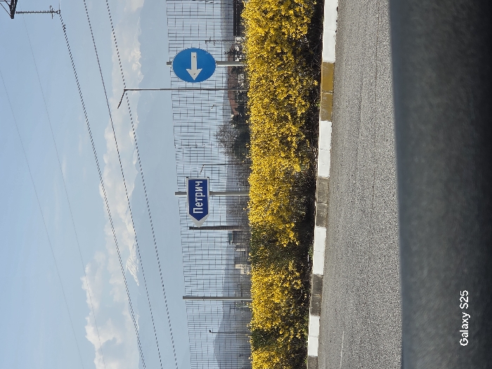 The image depicts an outdoor scene in Novo Delchevo, Bulgaria, under clear daytime conditions. An asphalt road surface occupies the lower portion of the frame, bordered by a concrete curb with alternating white and yellow painted sections. Immediately behind the curb, a dense, continuous row of bright yellow flowering bushes extends horizontally across the middle ground. Above these bushes, a metal grid fence is visible. Two blue road signs are prominently displayed: a rectangular directional sign with a white arrow pointing left and the Cyrillic text "Петрич" (Petrich), and a circular sign to its right featuring a white left-pointing arrow. In the distant background, a range of snow-capped mountains is visible beneath a light blue sky with scattered white clouds. Several horizontal wires, possibly power lines, traverse the upper sky. A faint industrial chimney-like structure is discernible behind the fence. No individuals or active subjects are present in the scene. A "Galaxy S25" watermark is located in the bottom left corner.