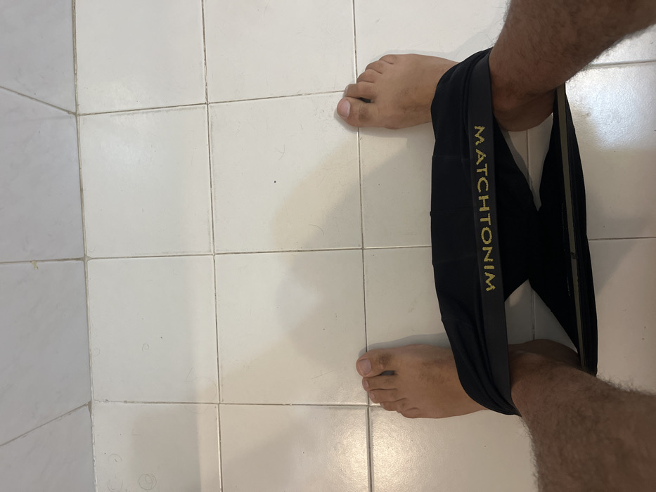 The image displays a downward view of an individual's bare feet and lower legs positioned on a white tiled floor, characteristic of an interior space such as a bathroom. The skin tone of the feet and legs is medium brown, with some hair visible on the lower legs. Black boxer briefs or similar undergarments are lowered around the ankles, resting on the floor. The elastic waistband of the undergarment is visible, featuring gold-colored text that reads "MATCHTONIM" when viewed right-side up. The floor consists of approximately 15x15 cm white ceramic tiles with light gray grout lines; minor dust particles and fibers are scattered across the tiled surface. A segment of a light-colored tiled wall is visible at the top, meeting the floor tiles. Shadows are cast on the floor directly beneath the visible legs. The scene is consistent with a private residence or establishment within Modiin-Maccabim-Reut, Israel, as suggested by the Hebrew-related text on the garment.