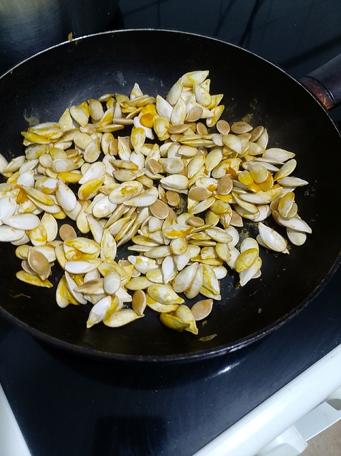 A black frying pan, approximately 25-30 cm in diameter, is positioned on a dark-colored stovetop surface in a kitchen located in Unknown, Unknown. The pan contains a substantial quantity of pumpkin seeds, some still encased in their white hulls, others appearing as light brown, unshelled kernels. Yellowish-orange fibrous residue, consistent with pumpkin pulp, adheres to many of the seeds and is scattered within the pan. The pan exhibits minor wear and tear, and a dark handle extends from its right side, partially visible. The stovetop itself is flat and reflective, with a white, possibly ceramic or plastic, edge of an adjacent counter or appliance visible along the bottom right. The background is dark and out of focus. No individuals are visible.