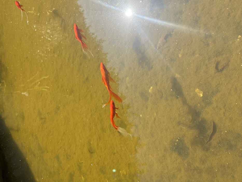 A sunlit pond scene shows several bright orange fish swimming in murky water